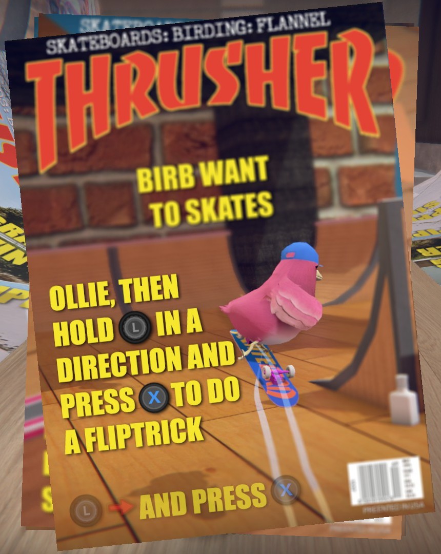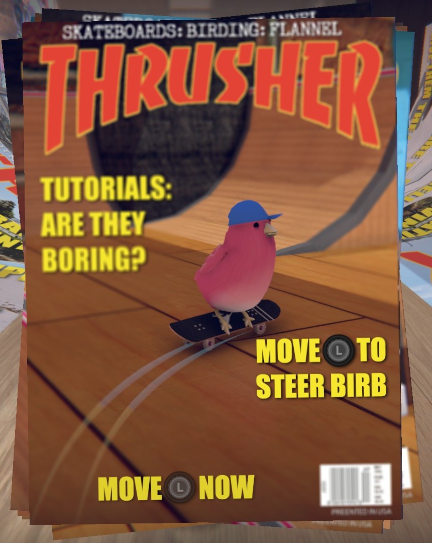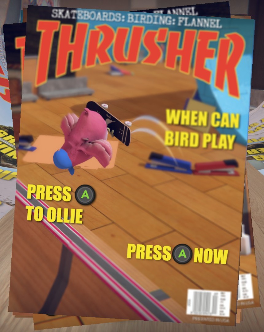 Grind on bendy straws, kick-flip over staplers, and carve killer lines through cardboard and sticky tape parks. Above all else, skate birds try their best!