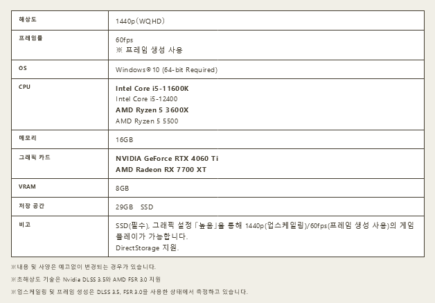 다이렉트스토리지를 지원하며 SSD는 필수이고, 모든 사양은 DLSS 3.5, FSR 3.0 업스케일링과 프레임 생성을 사용했습니다.