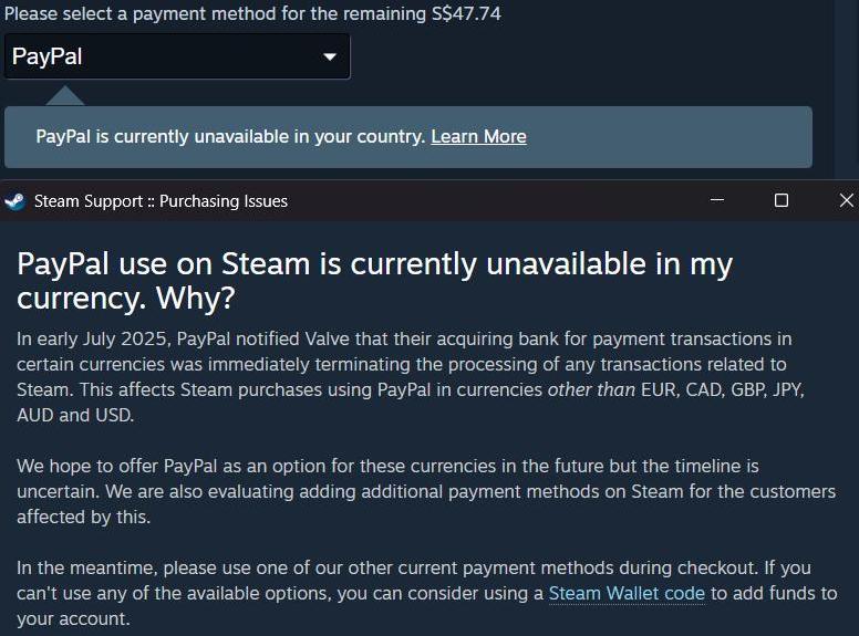 밸브에 따르면 2025년 7월 초, 그러니까 위에서 말한 때부터 페이팔은 매입 은행(Acquiring bank)이 밸브에게 특정 통화의 결제 거래와 관련 있는 모든 결제 처리를 즉시 종료한다고 통보했습니다.