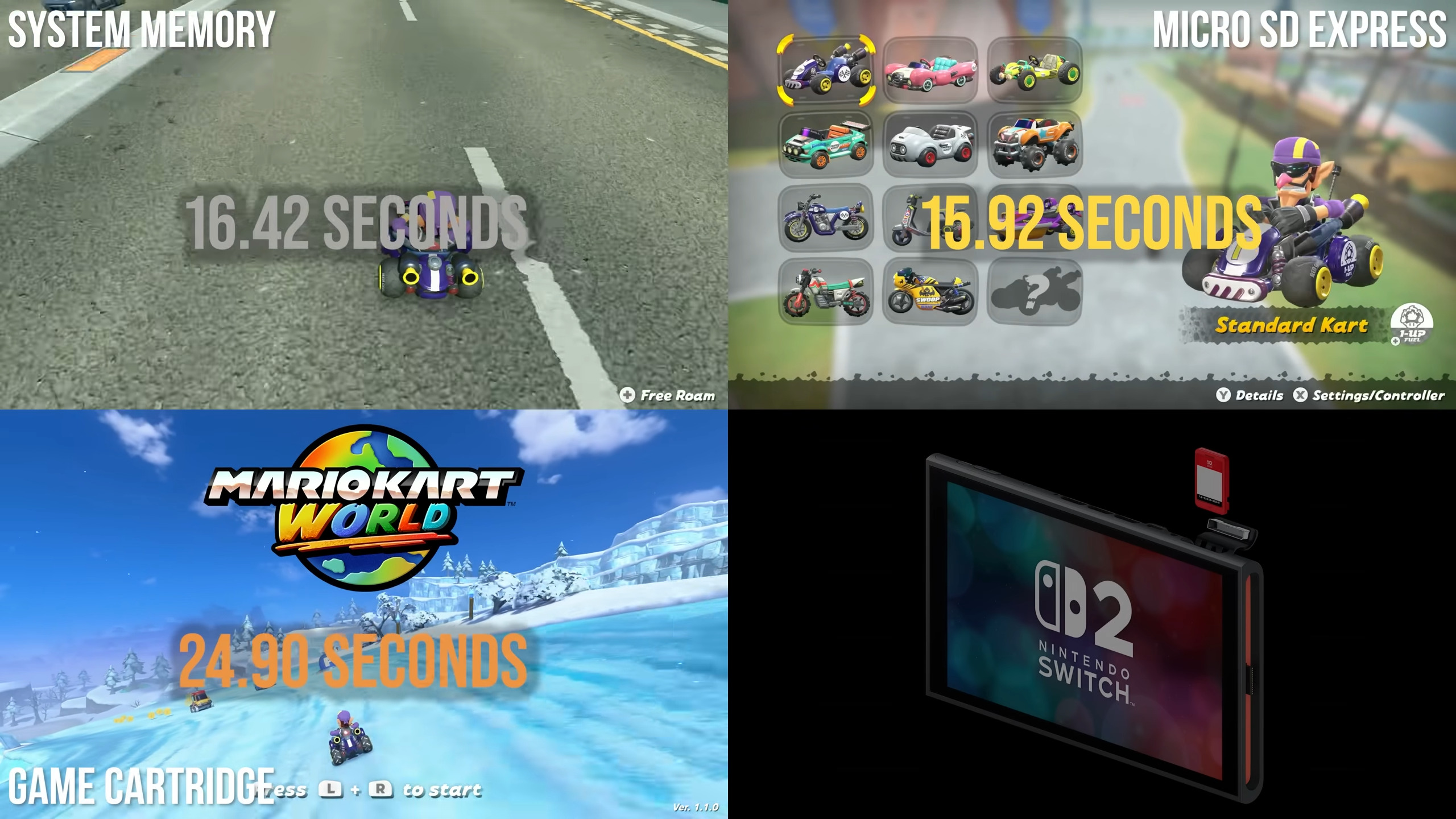 디지털 파운드리 등 여러 매체가 비교한 결과 스위치 2 내장, 마이크로 SD 익스프레스와 비교해 게임 카드는 게임 부팅 속도가 훨씬 느렸습니다.
