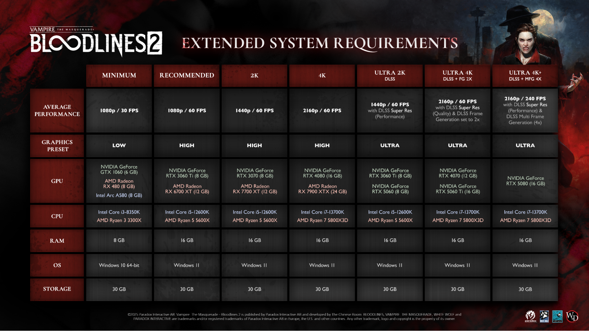 패러독스 인터랙티브는 10월 21일(한국 22일) 출시하는 뱀파이어: 더 마스커레이드 - 블러드라인 2(Vampire: The Masquerade - Bloodlines 2)의 PC 요구사양을 공개했습니다.