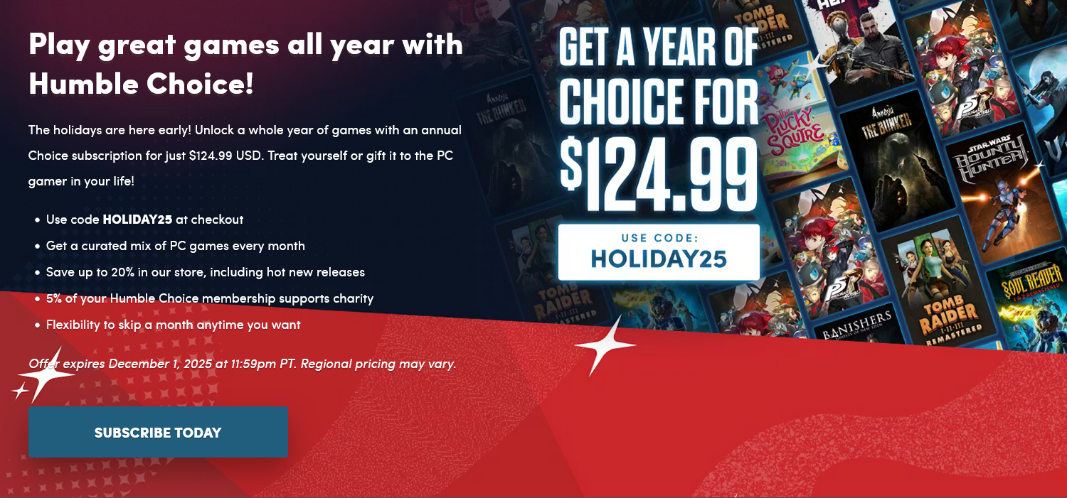 험블 번들은 험블 초이스 1년 구독권을 124.99달러에 구매할 수 있는 코드를 제공하기 시작했습니다.