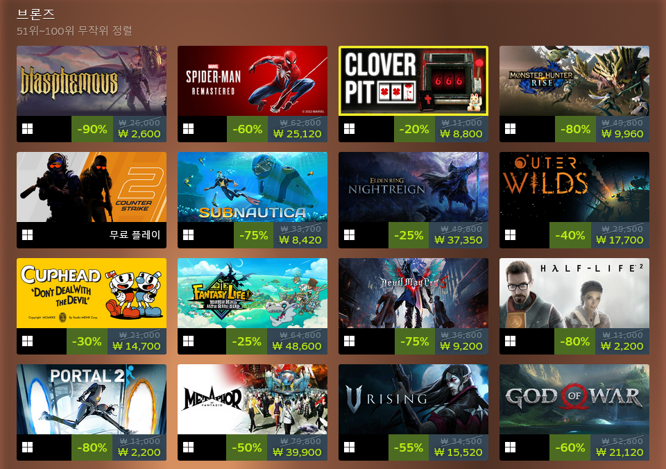낮은 성능의 휴대 기기라는 특징상 최신 게임이 적고, 가볍게 즐길 수 있는 게임이 많으며 스팀 덱 완벽 호환 여부는 따지지 않습니다. 성능 때문인지 순위 변화가 크지 않은 편이죠.