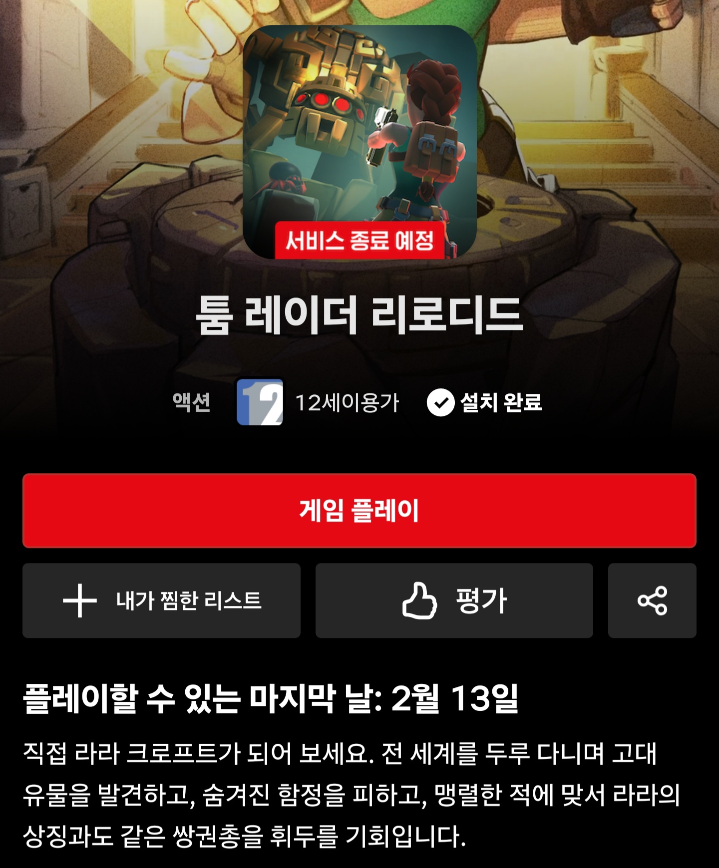 2023년 출시한 모바일 게임인 툼 레이더 리로디드(Tomb Raider Reloaded)가 2026년 2월 13일 넷플릭스에서 제거됩니다.