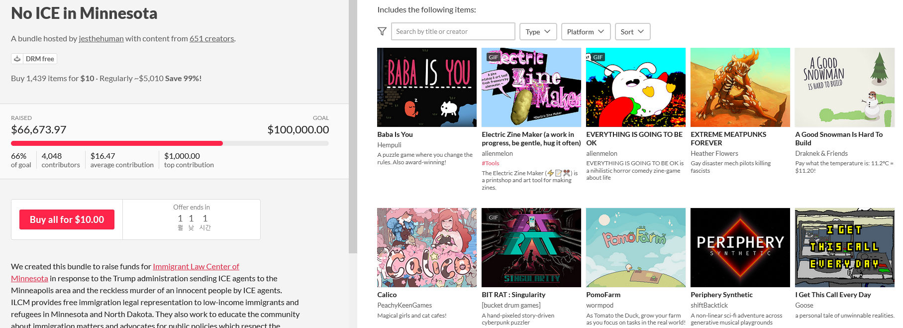 No ICE in Minnesota라는 이름이며 미네소타에서 ICE가 무고한 사람을 살해한 일에 반대해 미네소타 이민 법률센터(ILCM)에 기부하는 번들입니다. ILCM은 저소득 이민자와 난민에게 무료로 법률 지원을 제공하는 단체입니다.