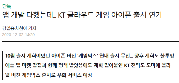 그리고 12월 2일, 아주경제는 단독으로 KT 게임박스의 iOS 서비스가 연기되었다고 전했습니다.