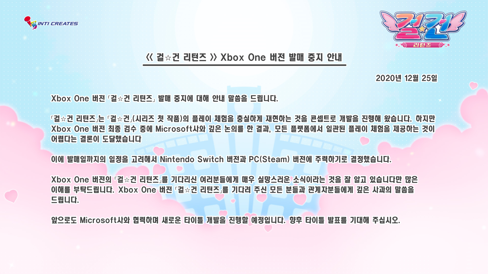 인티 크리에이츠는 2021년 PC, 엑스박스 원, 스위치로 출시하는 걸☆건 리턴즈의 엑스박스 원 출시를 취소했다고 밝혔습니다.