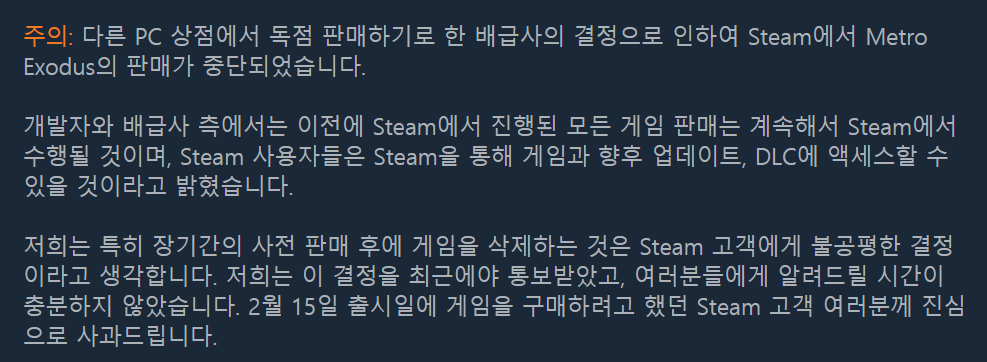 특히 메트로 엑소더스는 긴 기간 스팀에서 예약판매를 하고 패키지에 스팀 키까지 담고서는 출시 약 2주를 남기고 1년 기간 독점으로 바꿨죠. 긴 기간 기다린 게이머를 농락한 겁니다.