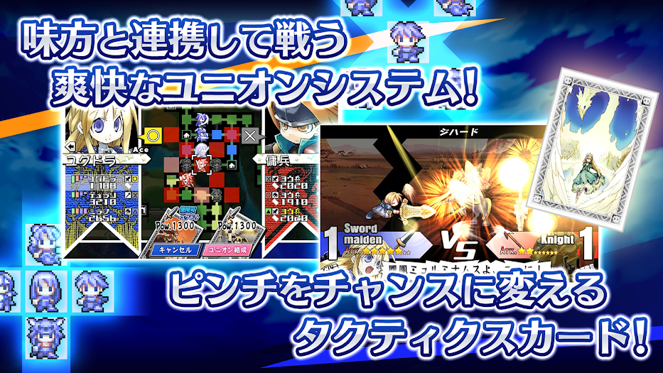 5명까지 함께 전투하는 유니온 시스템, 다양한 효과를 가진 카드를 활용하는 시스템이 특징입니다.