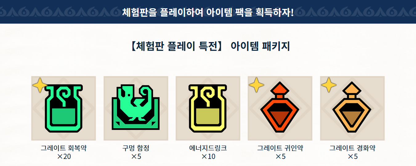 체험판을 플레이한 뒤 본편을 구매해서 플레이하면 특전도 제공합니다. 특전은 그레이트 회복약 20개, 구멍 함정 5개, 에너지드링크 10개, 그레이트 귀인약 5개, 그레이트 경화약 5개로 스위치와 동일합니다.