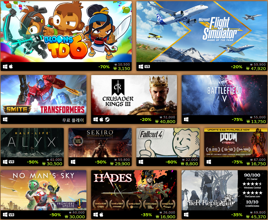 최다 판매작은 2021년 동안 스팀에서 가장 많은 돈을 번 100개의 게임으로 수익에 따라 플래티넘, 골드, 실버, 브론즈로 정리했습니다.