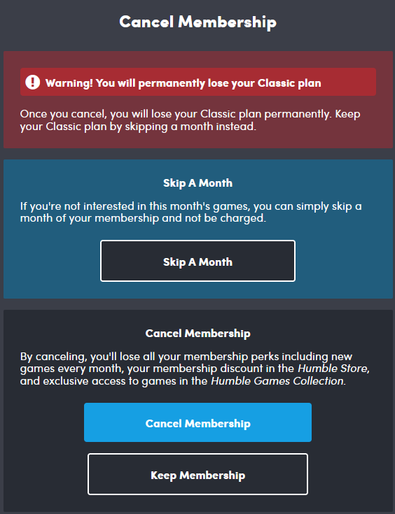 건너뛰기를 누르면 나오는 문구입니다. 이번 달 게임을 못 사고, 험블 게임즈 컬렉션도 이용하지 못하며, 험블 스토어 할인도 초기화한다는 내용이죠.