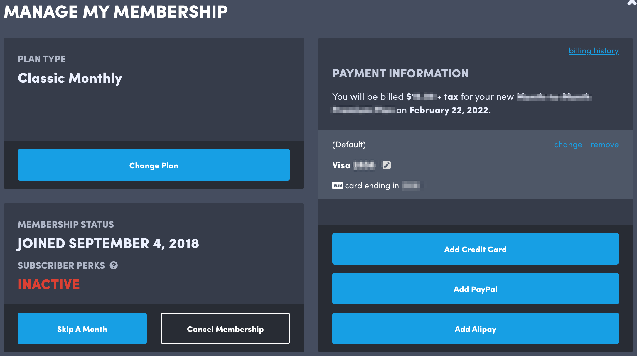 왼쪽 아래를 보면 건너뛰기(Skip A Month) 혹은 해지(Cancel Membership)가 있습니다.