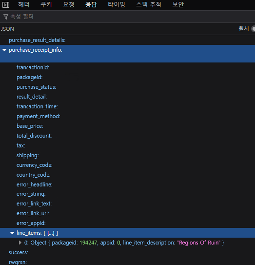패키지 ID는 지역제한 등을 확인할 때 사용하며 packageid 뒤에 있고, 게임 이름은 line_item_description 뒤에 있습니다.