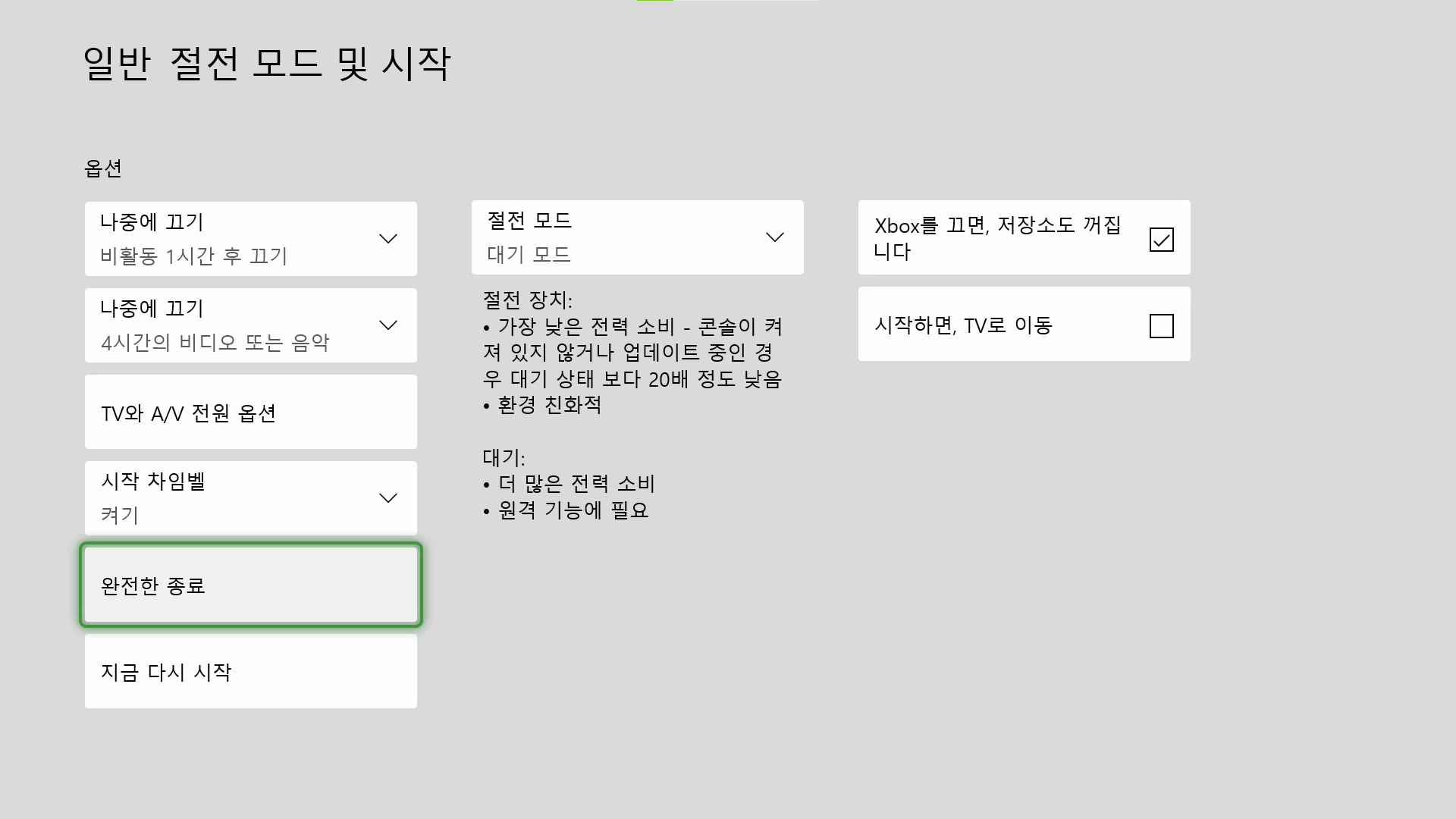엑스박스는 기기를 끌 때 전원 설정이 2가지가 있습니다. 대기 모드(Standby)와 절전 모드(Energy saver)입니다.