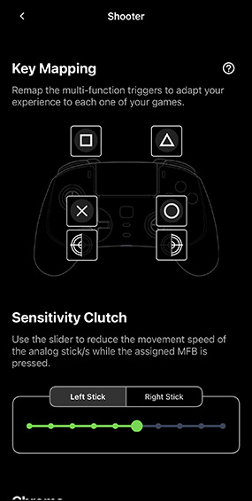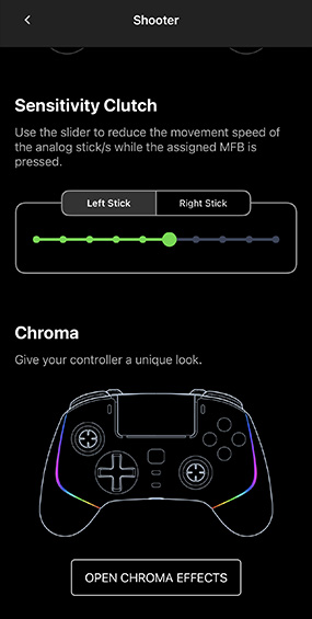 모바일 앱을 제공하며 앱에서 쉽게 버튼 지정, LED 변경, 감도 조정 등을 할 수 있습니다.