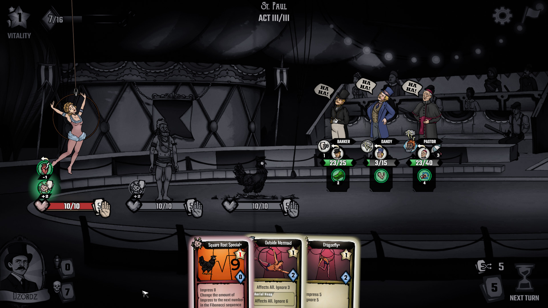 망해가는 서커스 단원이 되어 카드 게임으로 청중을 즐겁게 합니다.