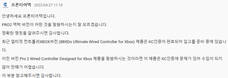 프론티어텍 홈페이지에 엑스박스용 프로 2 유선 컨트롤러의 출시를 묻는 글이 올라왔고 회사가 답변한 내용입니다.