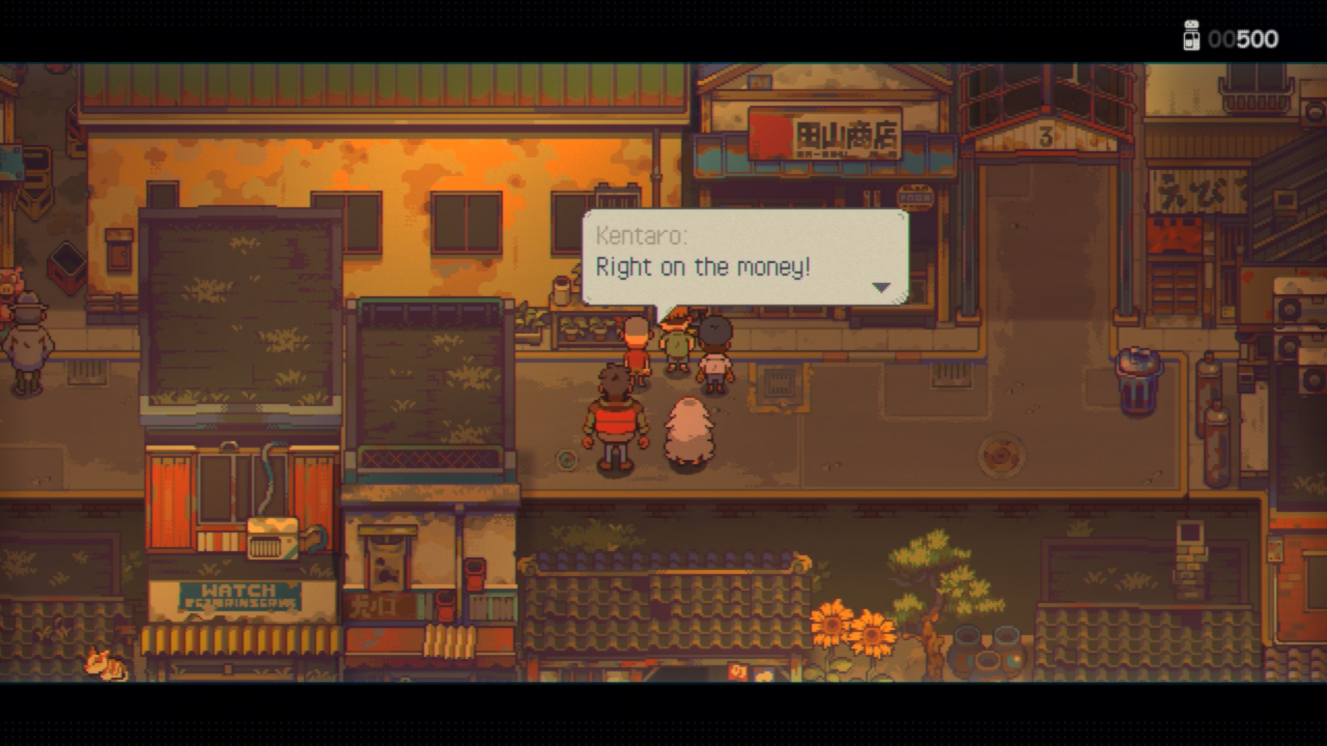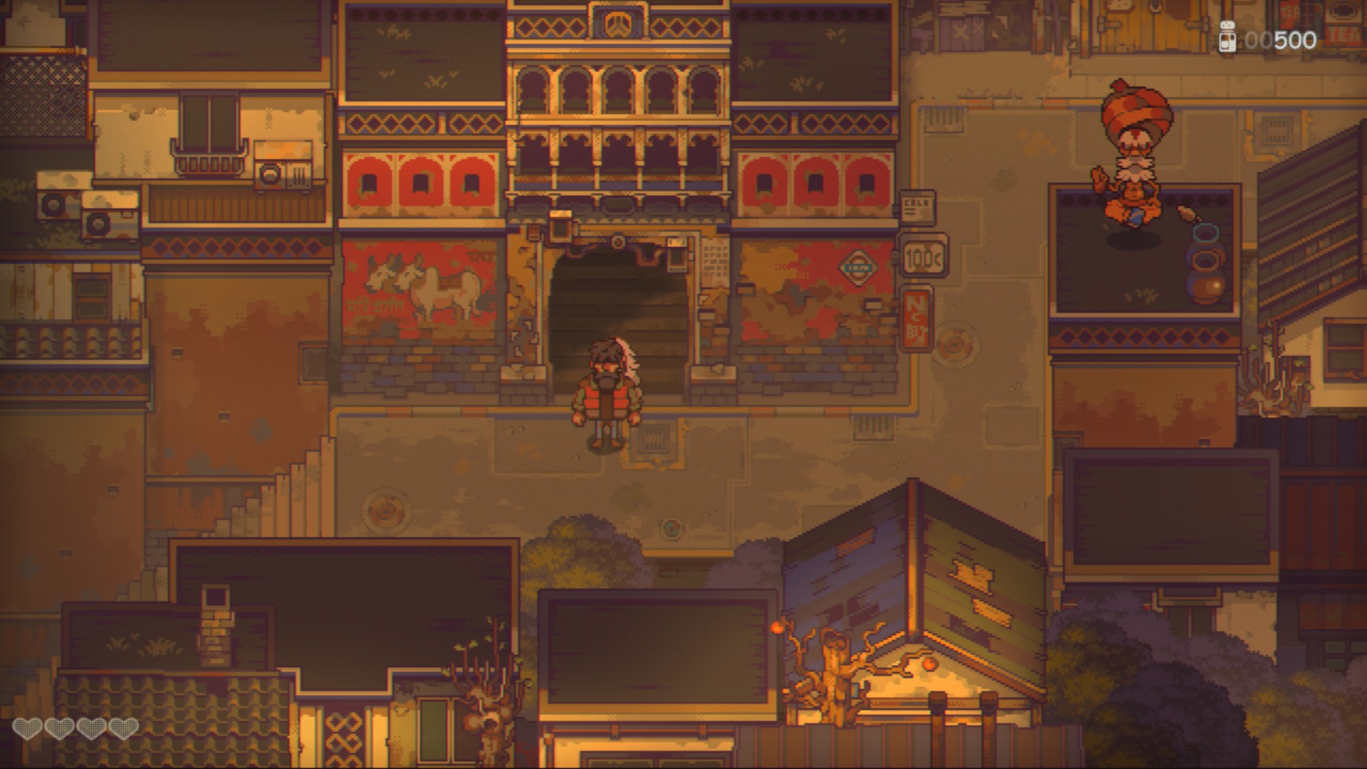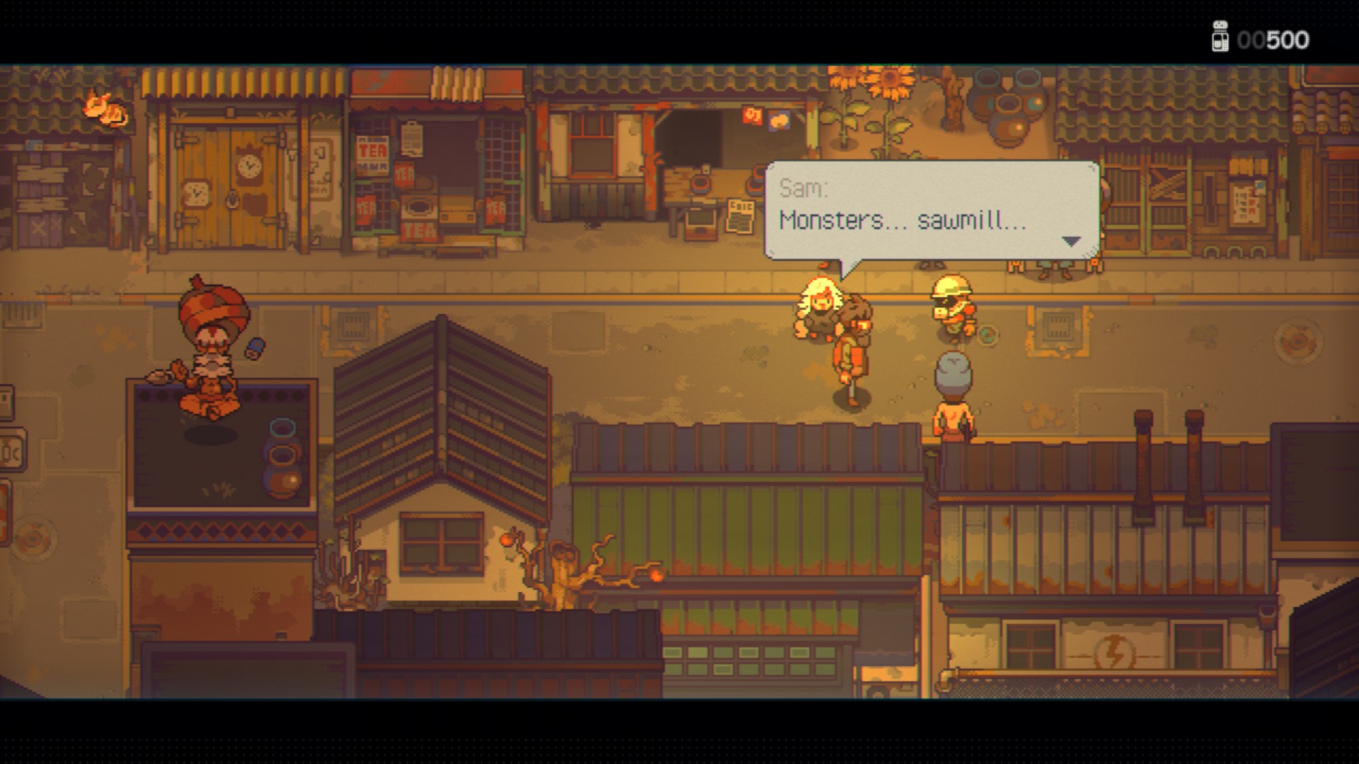 왼쪽의 남자가 존, 오른쪽의 흰머리 여자아이가 샘입니다. 오른쪽 위에 있는 병은 돈, 왼쪽 아래 하트는 체력입니다.