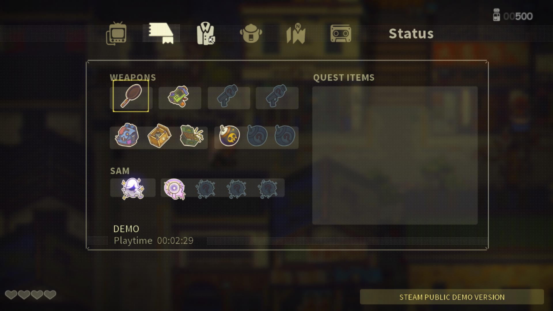 스타트 버튼을 누르면 장비, 가방, 요리법, 지도, 퀘스트 로그가 있습니다.